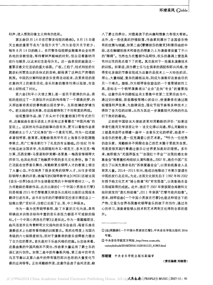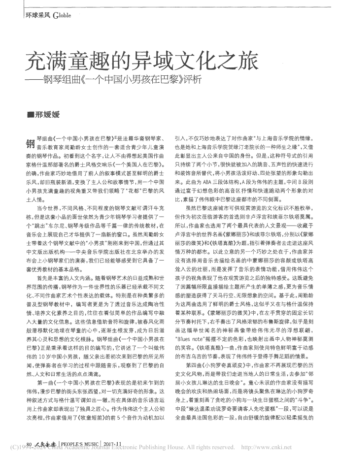 邢媛媛《充满情趣的异域文化之旅——钢琴组曲《一个中国小男孩在巴黎》评析(CSSCI)》—《人民音乐》2017(11)