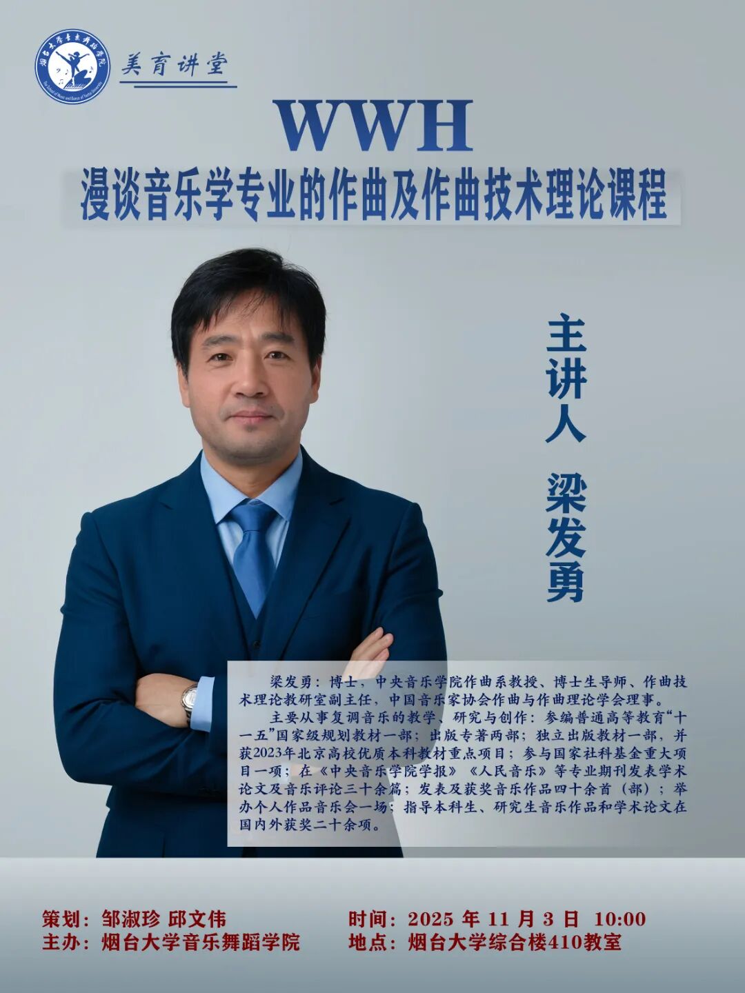 自2019年以来,烟台大学音乐舞蹈学院已举办四届艺术月活动,为师生搭建了优质的学术交流和艺术实践平台。2025年11月,音乐舞蹈学院将启动第五届艺术月暨艺术研究与实践论坛活动,本届艺术月以学术论坛为核心载体,打造集理论研讨、实践交流、成果展示于一体的系列活动,邀请中央音乐学院、北京大学歌剧研究院、星海音乐学院等多位专家来院讲学,与兰州城市学院开展交流互访,以“理论前置+实践引导”,提高师生对音乐理论的深度研究与反思能力,让理论成为实践的“导航仪”。