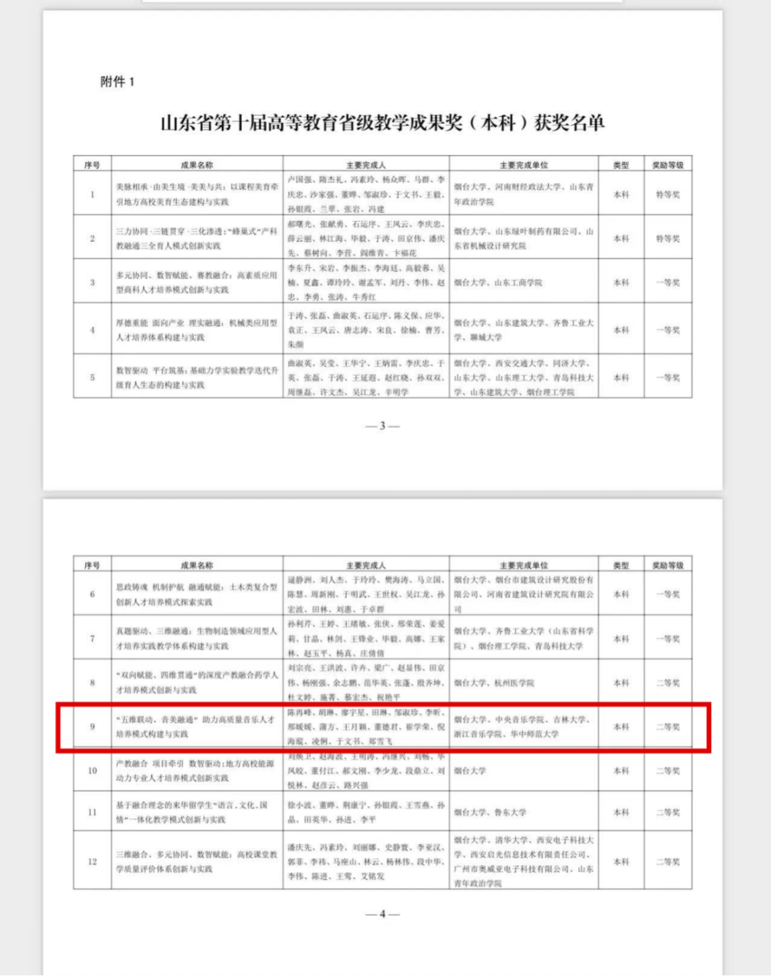 由烟台大学陈再峰教授领衔的“五维联动·音美融通”助力高质量音乐人才培养模式构建与实践,荣获第十届高等教育教学成果奖省级教学成果二等奖。