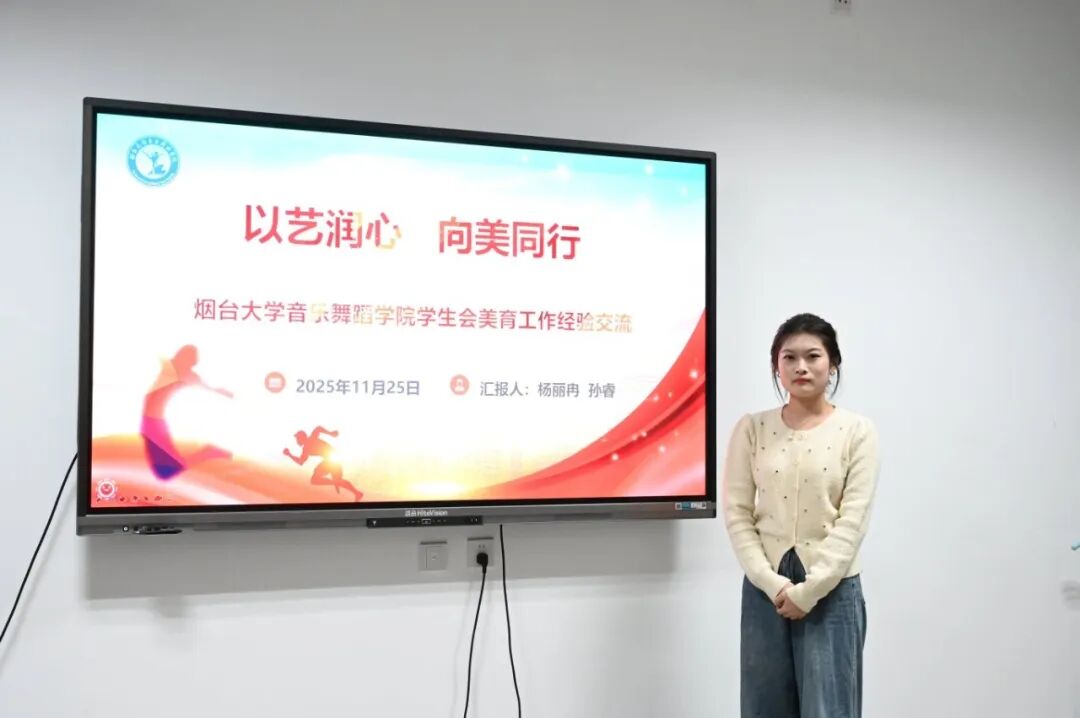 在交流环节,烟台大学音乐舞蹈学院团委学生会骨干分别以《以“美”为媒 融合共进》《以艺润心 向美同行》为题,进行了工作经验分享。她们谈到,我院的美育工作并非局限于专业内部,而是通过校内外两种路径辐射全校和周边社区。“秋之乐章——行走的艺术课堂”音乐知识普及活动力求为全校同学普及艺术知识,提升审美素养;另一方面,学院团委与祥隆社区、学韵社区等周边社区开展常态化志愿服务活动,引导团员青年弘扬志愿服务精神,在服务社会中贡献力量、增长才干。