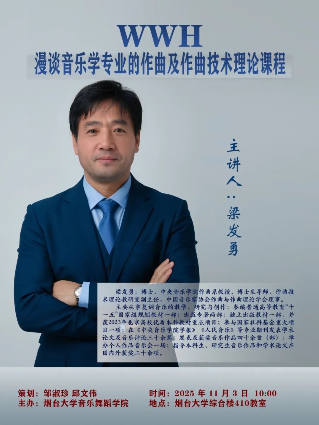 美育讲堂| WWH——漫谈音乐学专业的作曲及作曲技术理论课程讲座主题WWH——漫谈音乐学专业的作曲及作曲技术理论课程讲座时间2025年11月3日 上午10:00讲座地点烟台大学综合楼410教室主讲人梁发勇主办单位烟台大学音乐舞蹈学院主讲人介绍梁发勇:博士,中央音乐学院作曲...2025-11-07 -